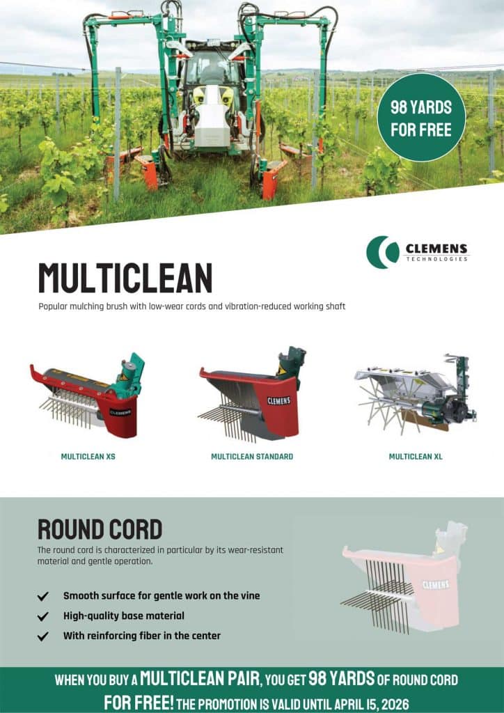 With the MULTICLEAN mulching brush you can remove the shoots and at the same time control weeds in the undervine area without interfering with the soil structure. The MULTICLEAN ist particularly low in vibration and has extremely robust and smooth strings, which are gentle on the vines. Different sizes are available for its various areas of application.
